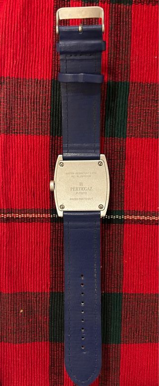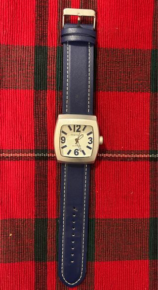 Elegante reloj Pertegaz con correa azul y detalles plateados. - Esfera cuadrada. - Correa de piel azul con pespuntes blancos. - Hebilla plateada.