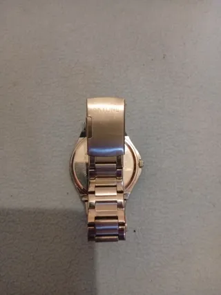 Elegante reloj de pulsera con diseño clásico. - Esfera plateada con detalles. - Indicador de fecha. - Brazalete metálico. - Cierre de seguridad.en perfecto estado a falta de la pila
