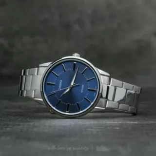 Elegante reloj Casio con esfera azul y detalles plateados. - Diseño analógico clásico. - Correa de metal plateado. - Esfera redonda con índices.