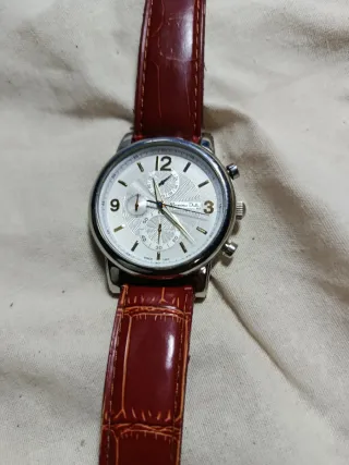 Elegante reloj de Massimo Dutti con correa marrón y detalles plateados. La correa como se puede observar está en mal estado pero el reloj está en muy buen estado y funciona perfectamente. - Esfera blanca con indicadores y agujas plateadas. - Bisel plateado.