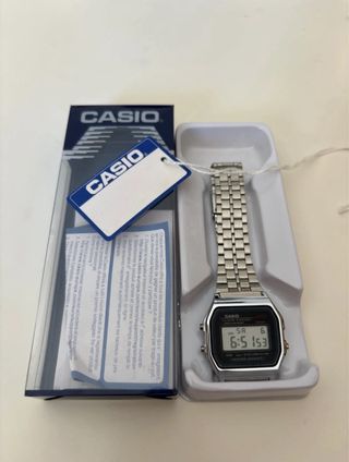 Reloj Casio modelo A159W con un diseño clásico y atemporal. - Correa de metal plateada. - Caja de resina negra. - Diseño vintage.