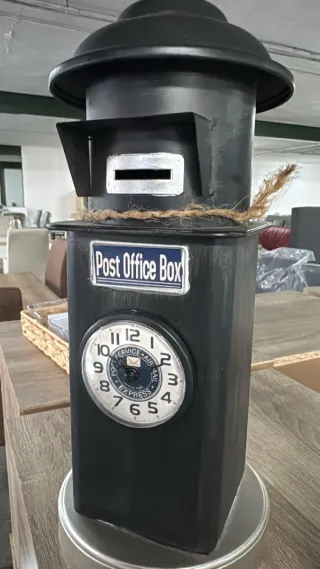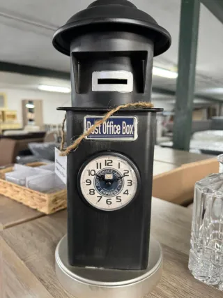 Original reloj con diseño de buzón de correos, que también funciona como hucha. - Diseño vintage. - Acabado en color negro y detalles plateados. - Con abertura para sacar las monedas por abajo
