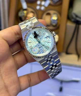 Elegante reloj Rolex Datejust con esfera azul y detalles plateados. Un clásico atemporal. - Caja y brazalete de acero inoxidable. - Bisel estriado característico. - Ventana de fecha.
