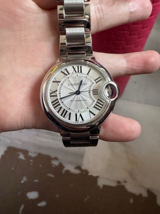 Elegante reloj de pulsera de la marca Cartier. - Esfera blanca con números romanos. - Brazalete de acero inoxidable. - Diseño clásico y sofisticado. - Precio negociable