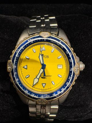 Pack de dos relojes de la marca Lotus. Uno de ellos es de color plateado y el otro tiene la esfera amarilla. - Reloj plateado con correa metálica. - Reloj con esfera amarilla y detalles en azul.