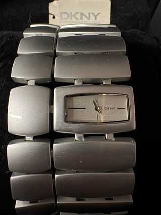Elegante reloj DKNY para mujer con un diseño moderno y sofisticado. - Pulsera de eslabones plateados. - Esfera rectangular con detalles sutiles. - Cierre de seguridad.