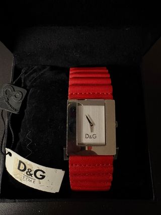 Elegante reloj de la marca D&G Dolce & Gabbana con una llamativa correa. - Diseño rectangular de la caja. - Correa de cuero con textura acanalada. - Esfera plateada con detalles. - Cierre de hebilla.