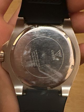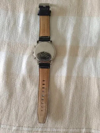 Su diseño cuenta con una carátula redonda de fondo oscuro y tres subesferas decorativas, además de una pequeña ventana con la fecha. La parte trasera de la caja es metálica y lleva grabado el detalle del modelo. La correa, cómoda y ajustable, muestra el sello “Genuine Leather”, garantizando que está hecha de cuero auténtico. Ideal para quienes buscan un estilo elegante y versátil, adecuado tanto para uso diario como para ocasiones formales. En buen estado general y funcionando correctamente