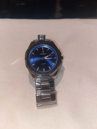 Este reloj Arlanch presenta un diseño llamativo y elegante. - Bisel con detalles en rojo y azul. - Esfera azul con marcadores plateados. - Correa de eslabones plateada.