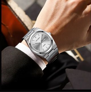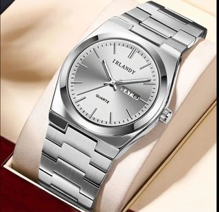 Elegante reloj de pulsera con un diseño clásico y moderno. - Esfera plateada con marcadores de hora. - Indicador de día de la semana. - Correa de metal plateado. - Movimiento de cuarzo.