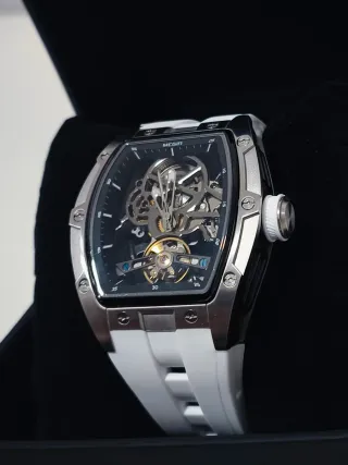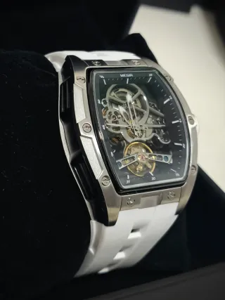 Elegante reloj mecánico para caballero con un diseño moderno y sofisticado. - Caja de acero inoxidable plateada. - Correa de silicona blanca. - Esfera con movimiento visible.