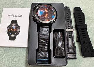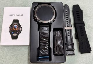 Reloj inteligente con un diseño moderno y elegante, ideal para el día a día. - Bisel con detalles en rojo y gris. - Correa de malla metálica negra. - Correa de cuero negra con costuras blancas. - Correa de goma negra. - Incluye manual de usuario.