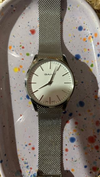Elegante reloj GANT con correa de malla plateada y esfera blanca. Muy cómodo, queda pegadito a la muñeca. - Diseño minimalista y moderno. - Correa ajustable de malla metálica. - Esfera redonda con detalles plateados.