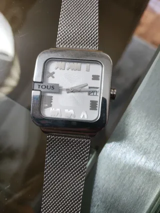 Precioso reloj de la marca Tous, un modelo ya descatalogado que no pasa de moda. - Diseño cuadrado con esfera blanca. - Correa de malla plateada. - Detalles en números romanos y símbolo de la marca.