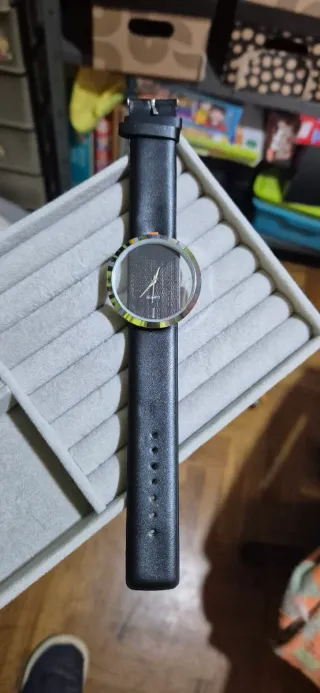 Reloj de pulsera con diseño inspirado en la Bauhaus. - Esfera negra. - Caja de acero inoxidable plateada. - Correa de cuero negra. - Movimiento de cuarzo - Tamaño de caja 39mm