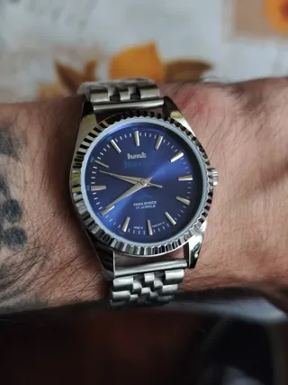 Reloj HMT Himalaya con esfera azul y detalles plateados - Esfera azul con acabado radial. - Indicadores de hora plateados - Correa de metal plateado.