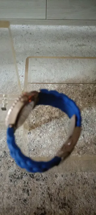 Reloj de pulsera con correa de tela azul y detalles plateados. - Esfera azul con números claros. - Correa de tela resistente. buen estado