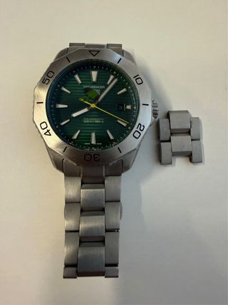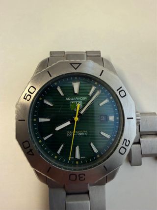 Reloj Aquaracer SolarGraph con esfera verde y detalles plateados. Un accesorio elegante y funcional. - Bisel giratorio unidireccional. - Indicador de fecha. - Brazalete de acero inoxidable. - Movimiento automático - Dos eslabones extra - Mira el precio para no hacer preguntas sin sentido.