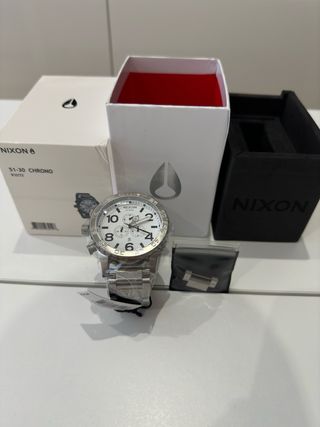 Reloj Nixon 51-30 Chrono en color blanco y plateado. Incluye su caja original y es un modelo de cronógrafo. - Caja de acero inoxidable. - Correa de metal. - Esfera blanca con detalles plateados. - Función de cronógrafo. - Manual de operaciones - Eslabón extra para hacer correa más grande