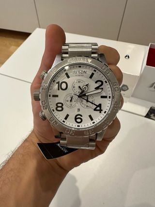 Reloj Nixon plateado time teller deluxe En muy buen estado Tiene dos minimas marcas que casi no se aprecian, en la ultima foto se pueden obeservar. Con su propia caja Habria que cambiarle la pila