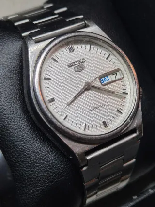 Reloj Seiko 5 Automático con esfera en color plata. Se encuentra funcionando, cambia de fecha perfectamente. Presenta marcas de uso normales que no afectan al funcionamiento (ver fotos). Cuenta con una correa original de la marca aunque no la correspondiente a este modelo. Ref. 6119-8083