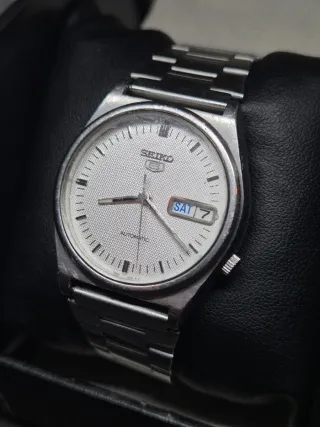 Reloj de pulsera Seiko 5 automático con esfera plateada y detalles texturizados. El brazalete es de acero inoxidable. Modelo: 7s26-3070 Ref: 603693 Marca: Seiko Caja: Acero inox 36mm s/c Tapa: Acero roscado Movimiento: Automático Cristal: Mineral Funciones: Calendario, impermeabilidad