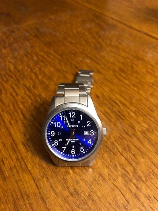 Elegante reloj de pulsera para hombre con esfera azul y detalles plateados. Buen estado. - Diseño moderno, elegante y deportivo. - Correa de metal. - Bisel con detalles. - Subesferas decorativas.