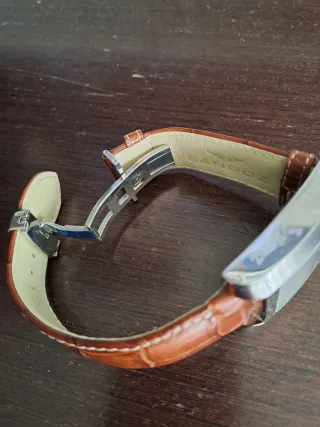 Elegante reloj de pulsera para caballero con detalles en plateado y correa marrón. - Esfera blanca con números arábigos. - Correa de piel. - Caja de presentación incluida. Está sin estrenar, en las fotos se aprecia que lleva los plásticos protectores. Puedo hacer lote para un solo envío.