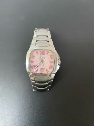 Elegante reloj de la marca Lotus con una esfera en tono rosa y detalles plateados. - Diseño moderno y llamativo. - Correa de eslabones plateada.