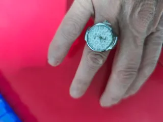 Este anillo tiene un diseño único que combina un reloj funcional con un accesorio de moda. - Esfera de color verde con detalles plateados. - Diseño tipo anillo para llevar en el dedo.