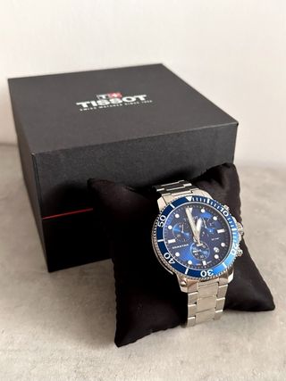 Reloj Tissot Seastar 1000 con cronógrafo. Color azul, esta nuevo sin marcas de uso. - Esfera de color azul. - Correa de acero inoxidable plateada. - Bisel giratorio azul.