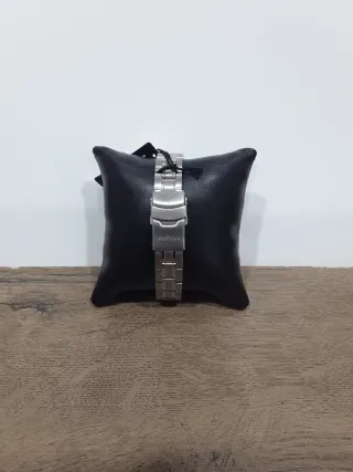 Elegante reloj de pulsera con diseño cronógrafo. - Esfera negra con detalles plateados. - Correa de eslabones plateada. - Resistente al agua 5 ATM. - sin pila.