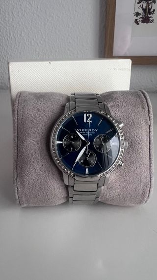 Elegante reloj Viceroy con esfera azul y detalles plateados. - Bisel adornado con pequeñas piedras. - Tres subesferas en la esfera principal. - Correa de eslabones plateada.