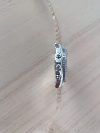 Elegante reloj de pulsera con un acabado plateado brillante. Ideal para complementar cualquier atuendo. - Diseño moderno y sofisticado. - Correa de metal ajustable. - Bisel giratorio con marcadores. -No tiene marca