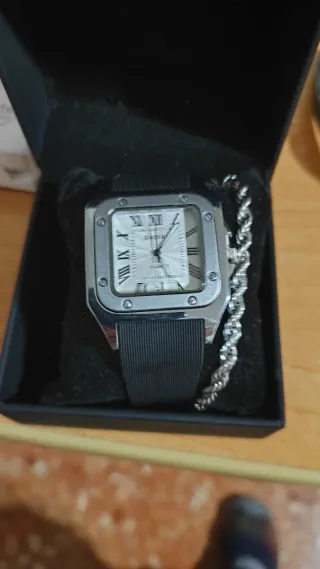 Conjunto de relojes y cadenas a estrenar. - Reloj con esfera negra y detalles dorados. - Reloj con correa plateada y esfera gris. - Cadena plateada con colgante.