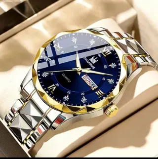 Elegante reloj de pulsera con una combinación de colores oro y plata. Su diseño combina detalles clásicos y modernos.RESISTENTE AL AGUA 💧 VIENE CON CAJA LUJO - Esfera azul con detalles en dorado. - Indicador de día y fecha. - Correa de eslabones metálicos.
