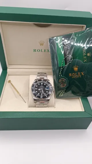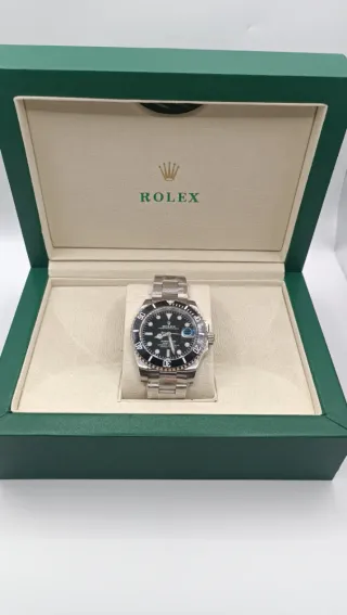 Reloj de pulsera Rolex Submariner con esfera negra y detalles plateados. - Caja y brazalete de acero inoxidable. - Bisel giratorio unidireccional. - Resistente al agua.