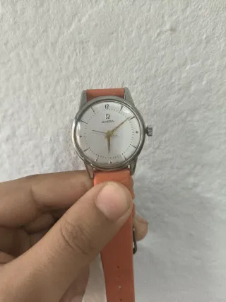 Reloj de pulsera Omega con correa de color naranja. - Esfera plateada. - Correa de cuero naranja. - Detalles plateados en la caja.