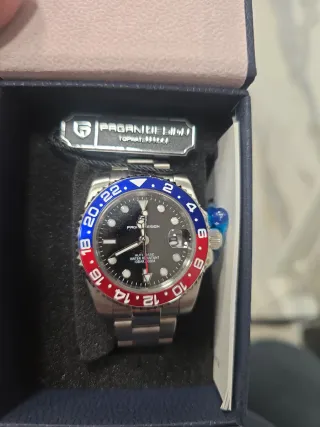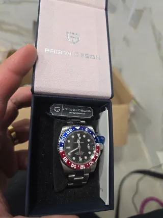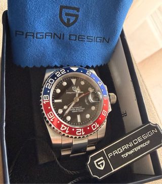 Reloj de pulsera con diseño deportivo y bisel GMT. - Bisel giratorio bidireccional con escala de 24 horas. - Esfera negra con marcadores de hora luminosos. - Correa de acero inoxidable. - Resistencia al agua de 100 metros. -El Pagani designe un reloj fabricado en honor al Rolex GMT II el famoso reloj quw combina con cualquier vestimenta!!elegante a la vez deportivo!!una joya para apreciar por parte de los verdaderos caballeros y los bien conocedores de una verdadera máquina del tiempo!! tiene su caja y su pequeño destornillador..para agrandar la correa que por cierto es de acero quirúrgico que le da un toque espectacular....