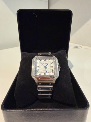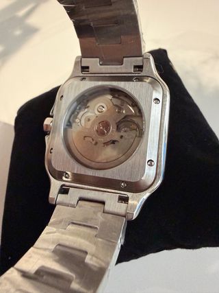 Reloj de pulsera hecho a mano con un diseño inspirado en el modelo Santos. - Esfera blanca con números romanos. - Correa de eslabones plateada. - Mecanismo automático visible NH35