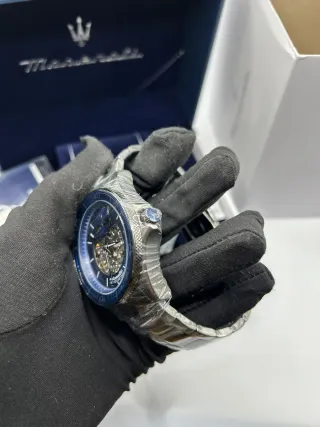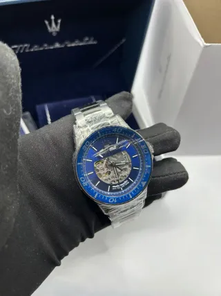 Reloj Maserati R8823140001 Material de la banda: acero inoxidable Color de Banda: Gris plateado Color de la caja: chapado en gris Tamaño de la caja: 44 mm Espesor de la caja: 11.4 mm Tipo de banda: Pulsera Ancho de banda: 22 mm Cierre: Doblar Color de la esfera: azul (centro del esqueleto) Movimiento: Automático Resistencia al agua: 100 metros
