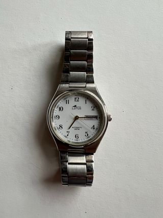 Reloj de pulsera Lotus con esfera blanca y detalles plateados. Día y fecha. - Mecanismo automático cosa rara en Lotus. - Resistencia al agua de 3 ATM. - Funciona correctamente.