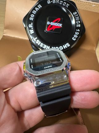 Reloj Imitación Casio G-Shock con caja y correa en acabado plateado y negro. - Diseño cuadrado icónico. - Bisel y pulsera de resina. - Pantalla digital. - Resistente a los golpes y al agua. - Ideal para deportes extremos.