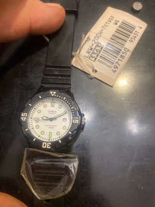 Reloj de pulsera con diseño deportivo y esfera negra. - Correa de resina. - Resistente al agua hasta 100 metros. - Indicador de día y fecha. -Reloj Casio tiene su plástico en el cristal aún solo q farta la pila