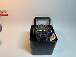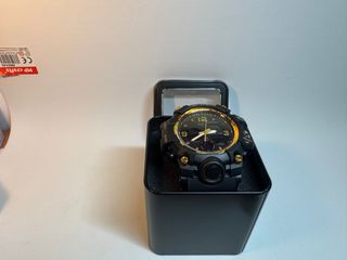 Reloj de pulsera con un diseño moderno y llamativo. - Correa con estampado de camuflaje. - Esfera con detalles en amarillo y rojo. - Incluye etiqueta original.