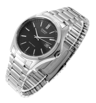 Reloj de pulsera analógico Casio con esfera negra y detalles plateados. - Modelo 1332MTP/1183P. - Esfera negra y correa de acero inoxidable con cierre desplegable. - Resistente al agua (Water Resist). - Movimiento de cuarzo japonés.