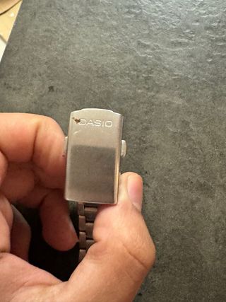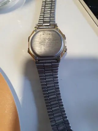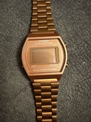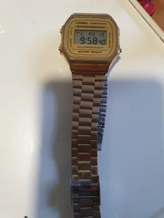 Reloj Casio de pulsera con acabado dorado. - Diseño clásico y elegante. - Correa metálica ajustable. - Pantalla digital. - Resistente al agua.
