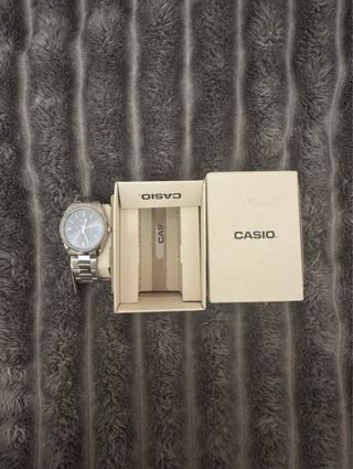 Reloj de pulsera Casio con un diseño atractivo, elegante y funcional. Es más bonito en directo por sus iridiscencias plateadas del dial cuando le da la luz. Tiene algunas microrayas del uso aunque su estado general es bueno. El cristal está perfecto. - Esfera plateada con detalles tornasolados. - Correa de eslabones de acero inoxidable. - Resistente al agua. - Caja de 37 mm - Cuarzo - Cristal mineral