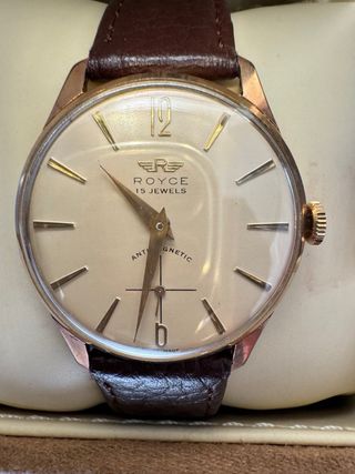 Reloj de pulsera Royce 15 jewels, antimagnético, con correa de piel autentica. - Caja de acero inoxidable. - Movimiento mecanico y cuerda manual. - Es un reloj de mas de 60 años perfectamente restaurado, revisado y en funcionamiento como si fuera el primer dia....... un trabajo excepcional por relojeros especializados.
