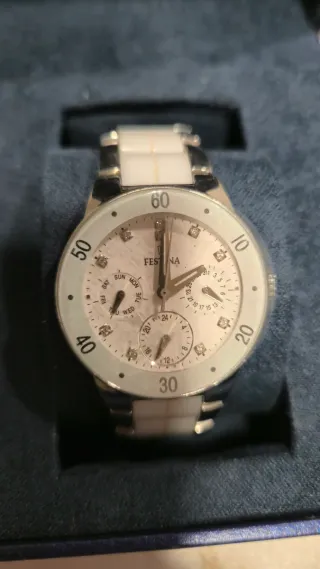 Elegante reloj Festina con detalles en blanco y plateado. - Esfera con marcadores de hora. - Pulsera de eslabones combinados. - Eslabón adicional